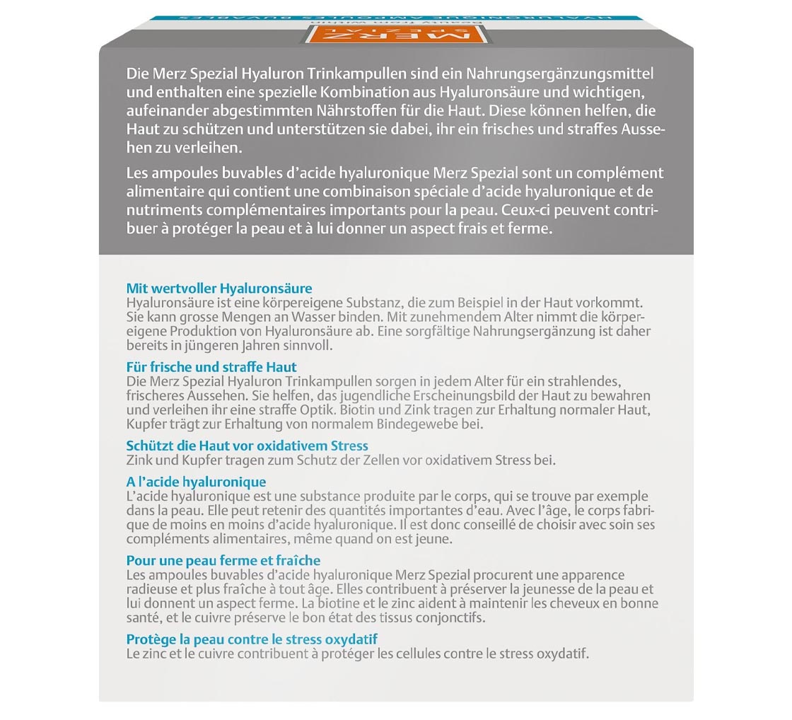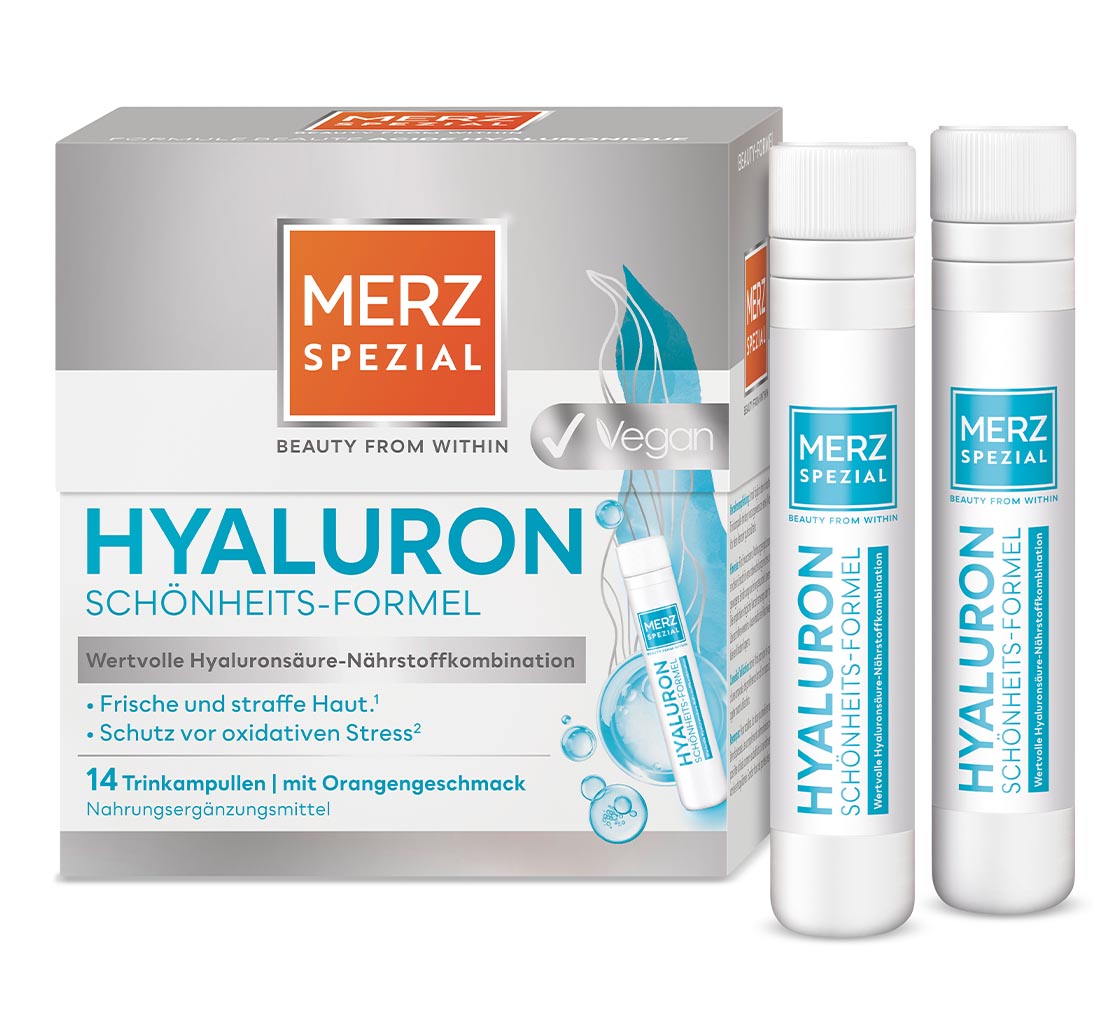 Gesunde, strahlende Haut entsteht nicht nur durch Cremes und Seren. Mit den Merz Spezial Trinkampullen mit Hyaluron oder Kollagen unterstüzt du deine Haut gezielt von innen – genau dort, wo wichtige Nährstoffe ihre Wirkung entfalten können. Die speziell abgestimmten Formeln liefern wertvolle Inhaltsstoffe, die deine Hautpflege sinnvoll ergänzen und deine tägliche Beauty-Routine erweitern.