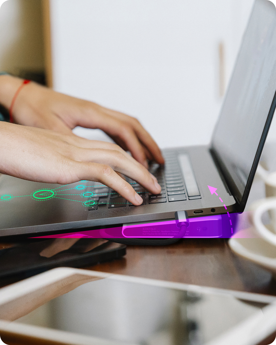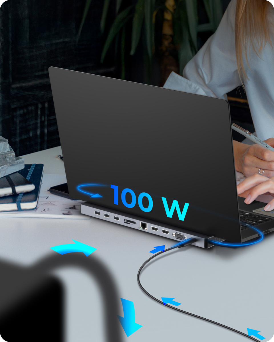 Dank Power Delivery können Notebooks über den USB Type-C-Port mit bis zu 100 Watt versorgt werden, während gleichzeitig Daten übertragen und Displays verbunden werden. Die Dockingstation dient zudem als Laptop-Erhöhung, verbessert die Ergonomie und sorgt für effiziente Wärmeableitung.
